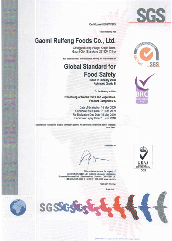 • 冷凍蔬菜衛(wèi)生注冊證書
